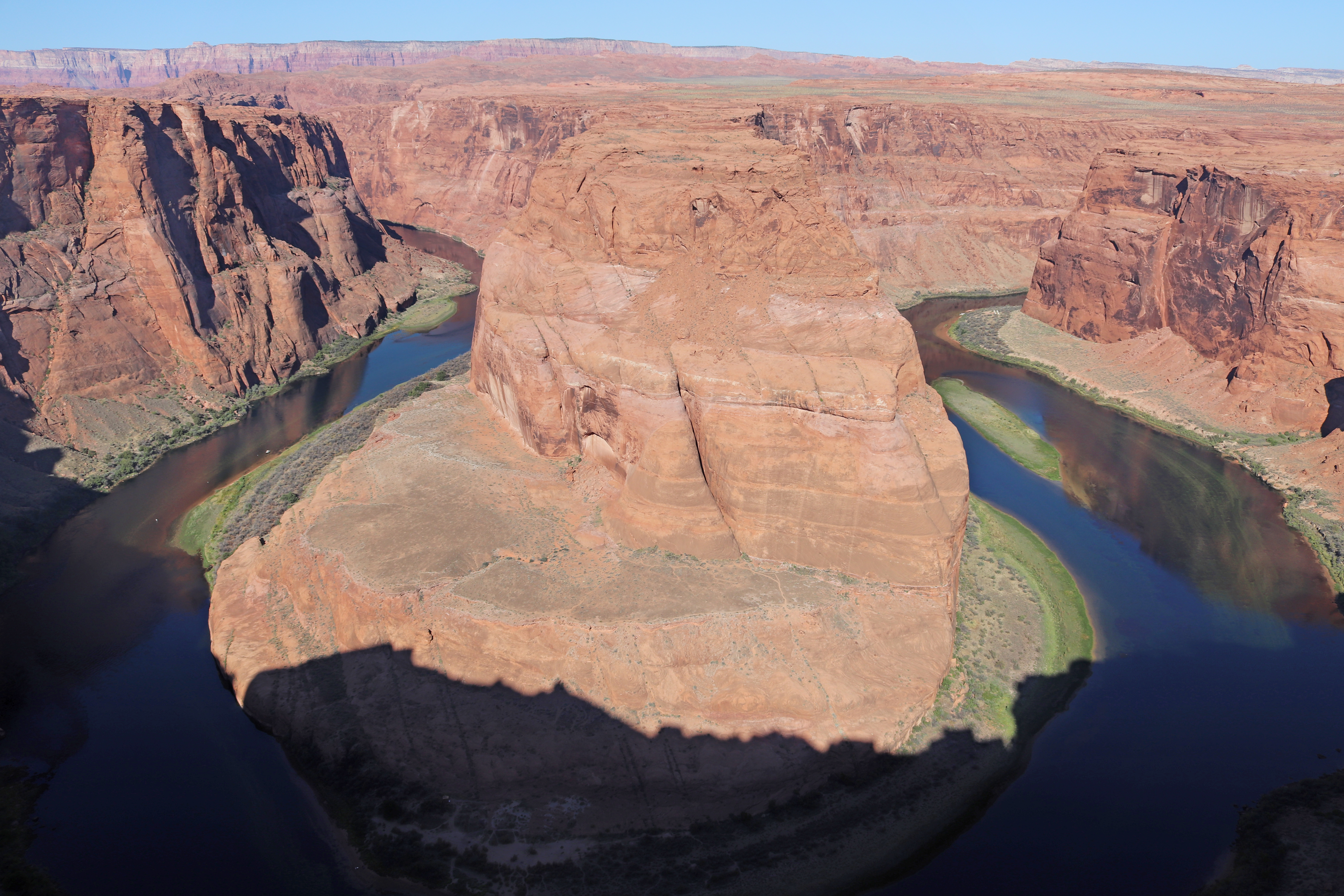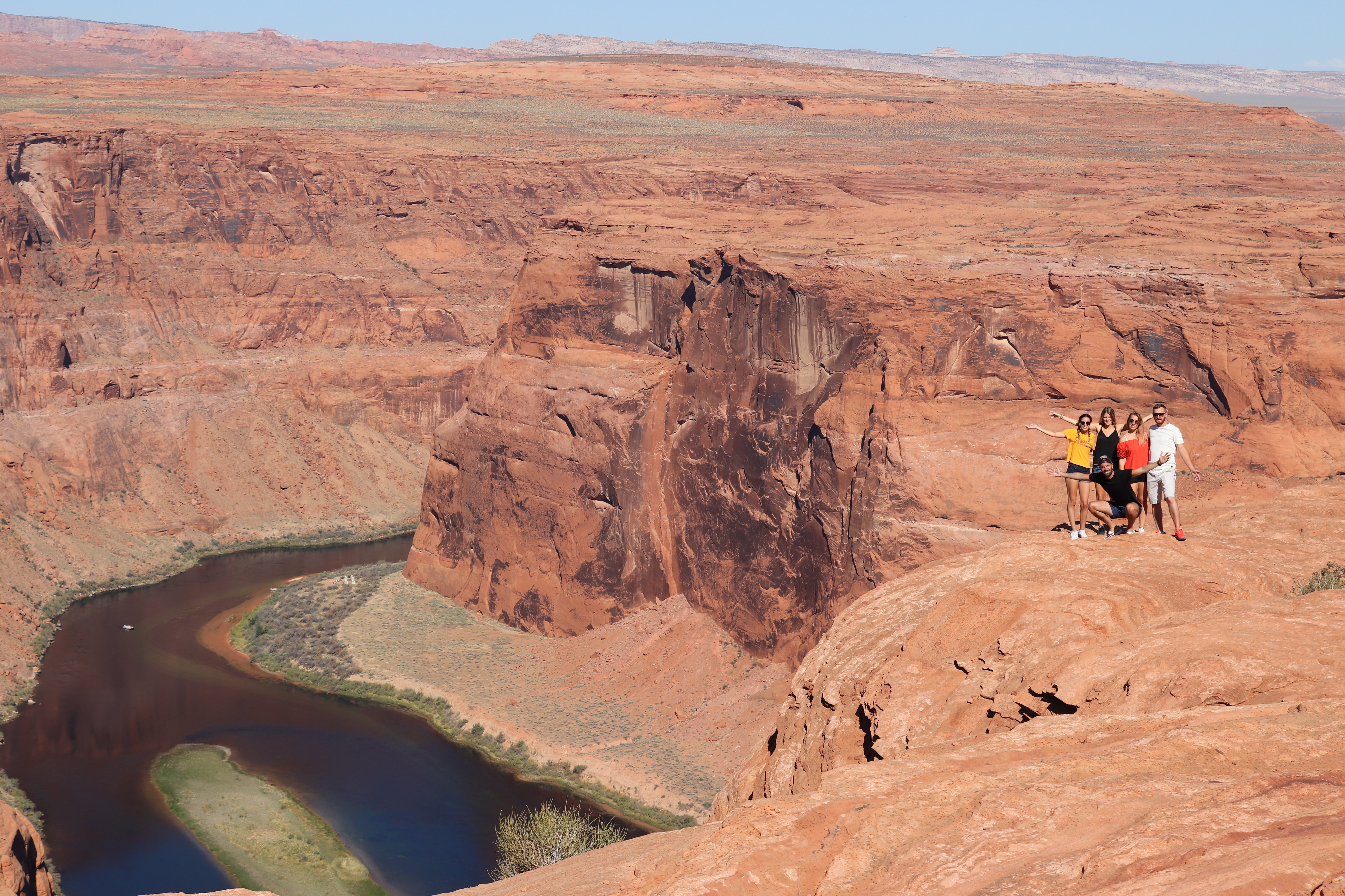 Arrivés au bout du chemin nous voilà devant l’Horshoe Bend. Il nous faudra plusieurs minutes pour observer cette vue gigantesque. En contrebas la rivière (méandre du Colorado) est d’un vert si sombre au milieu de ces hautes falaises rouges-oranger.